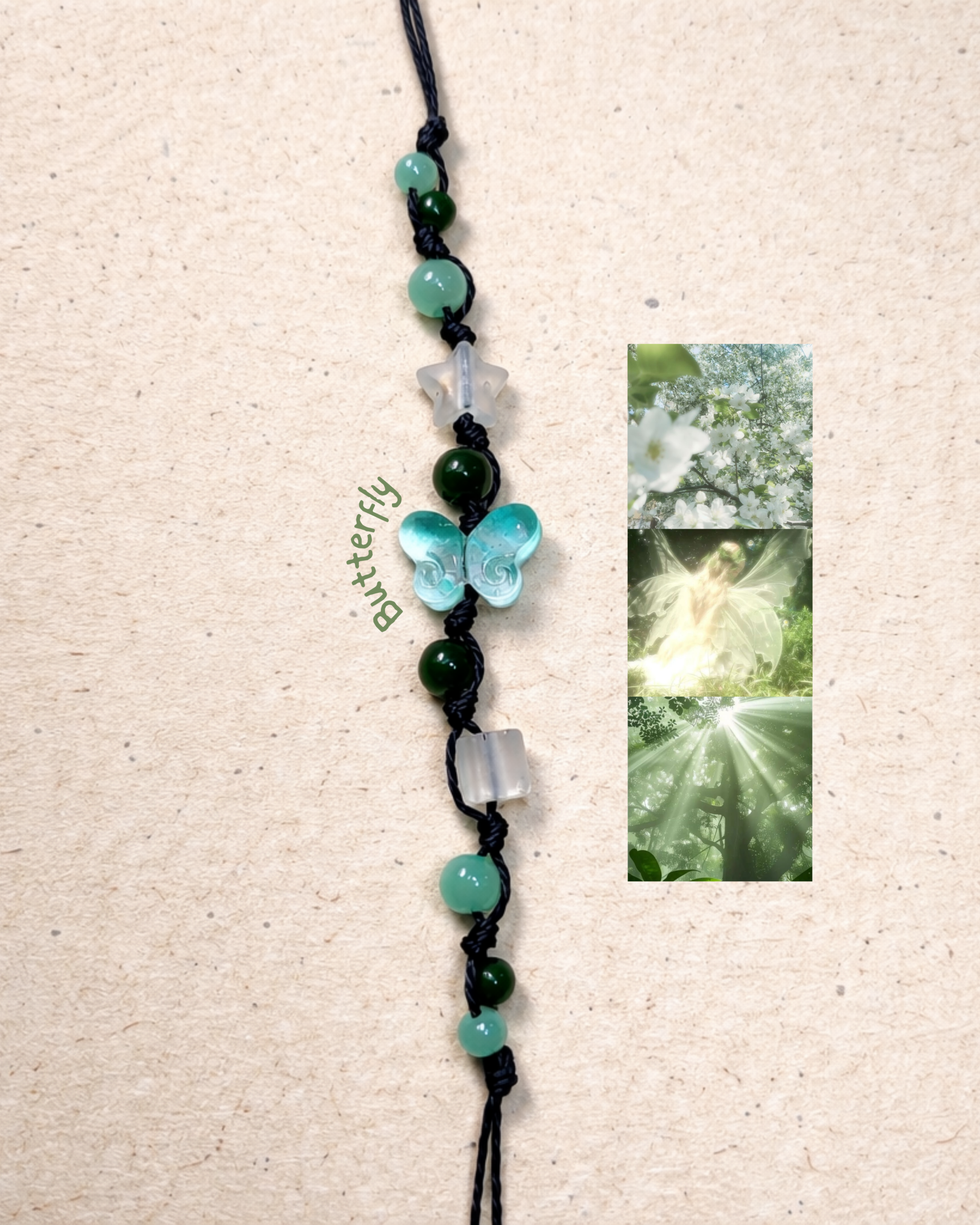A delicate handmade bracelet featuring a green butterfly charm — designed to symbolize growth, freedom, and natural beauty.